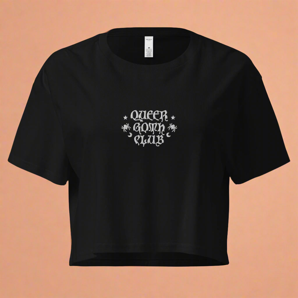 Welcome to the club. The Queer Goth Club crop top features an embroidered design with stars, spiders, and moons, perfect for anyone who blends spooky vibes with queer pride. A soft, comfy fit for your haunted season look.