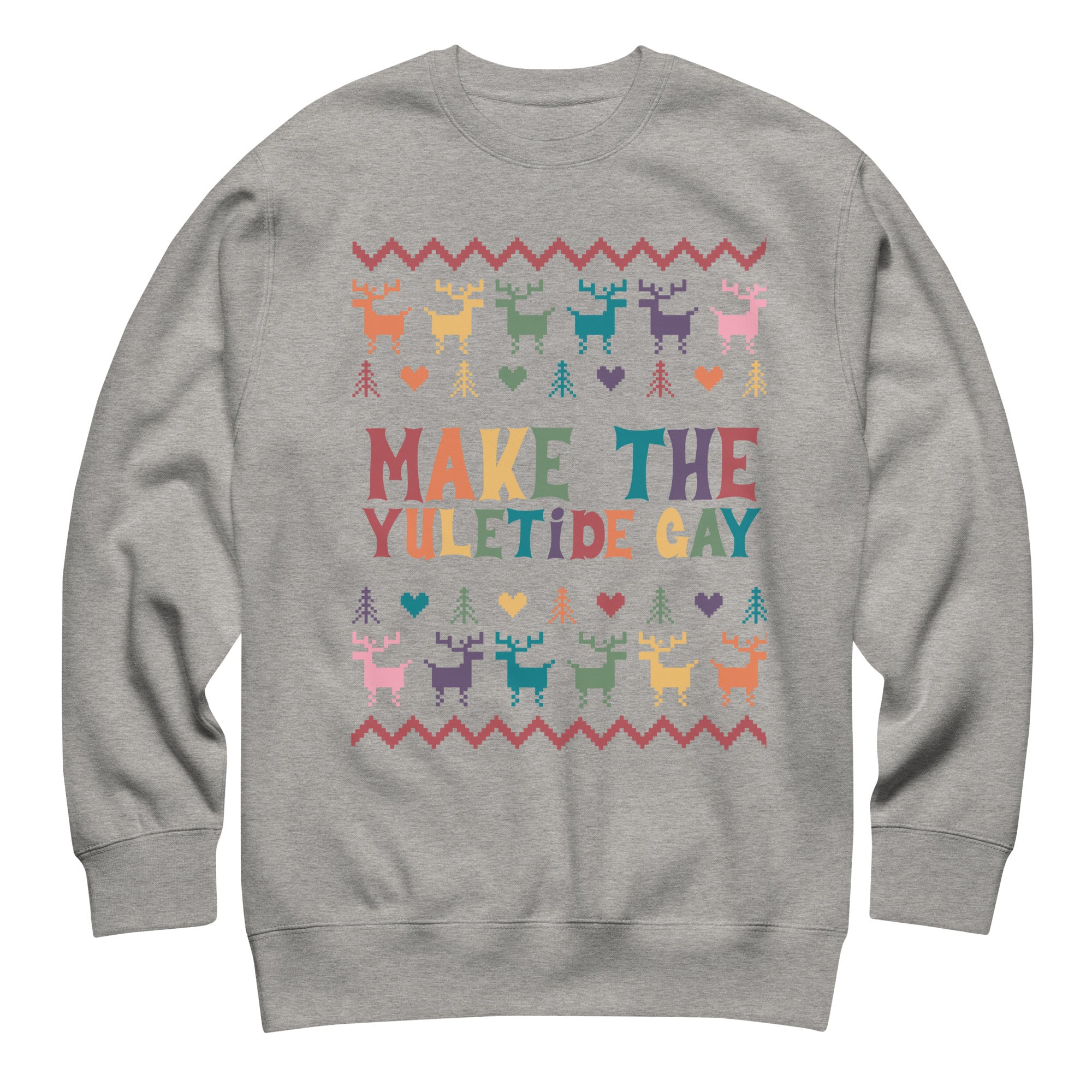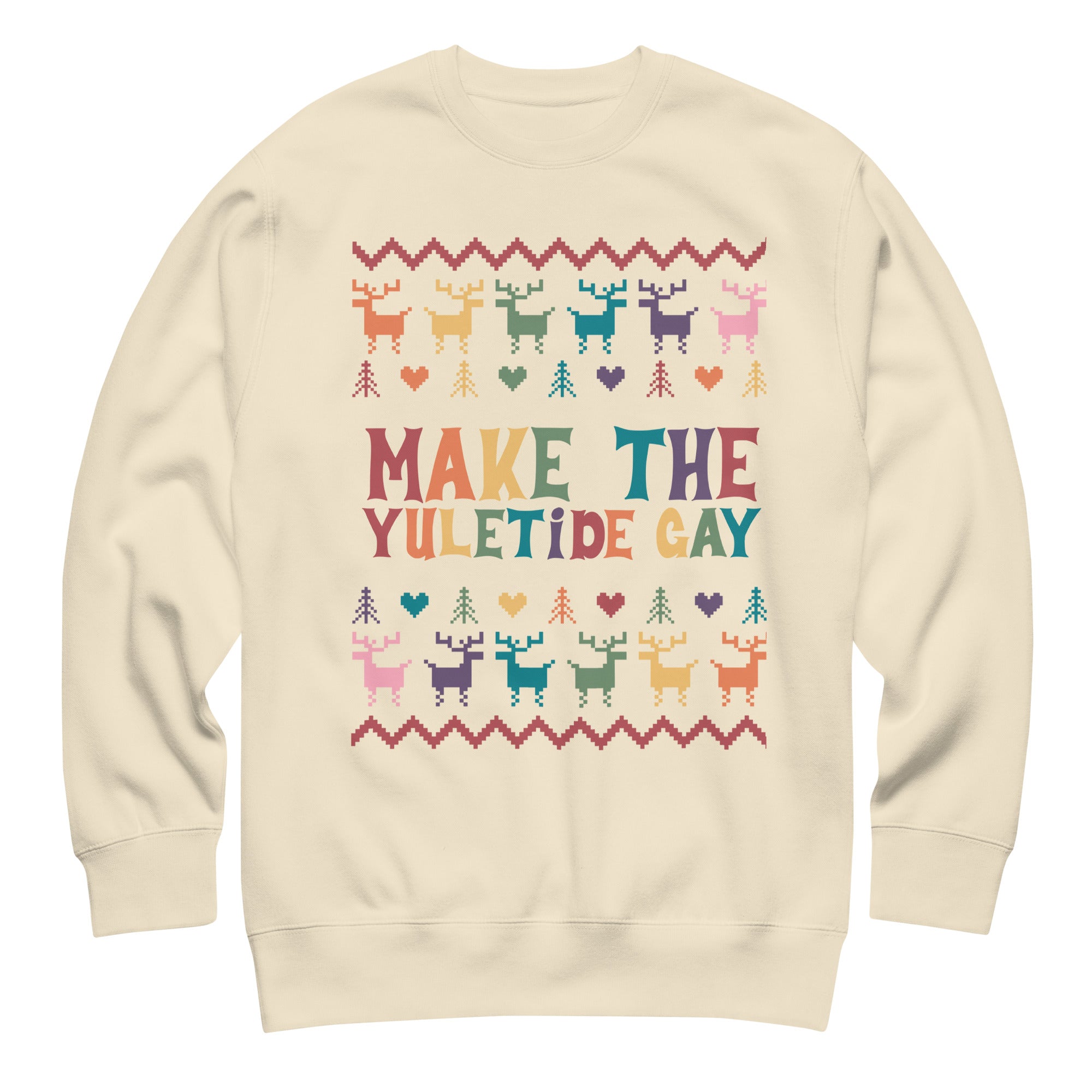 Spread holiday cheer with a colorful twist! Our Make The Yuletide Gay Premium Ugly Sweater features the phrase “Make The Yuletide Gay” in vibrant rainbow colors, paired with festive Christmas motifs. Soft, cozy, and fun, it’s the perfect way to celebrate the season with pride and humor. Get ready to turn heads at your next holiday gathering!