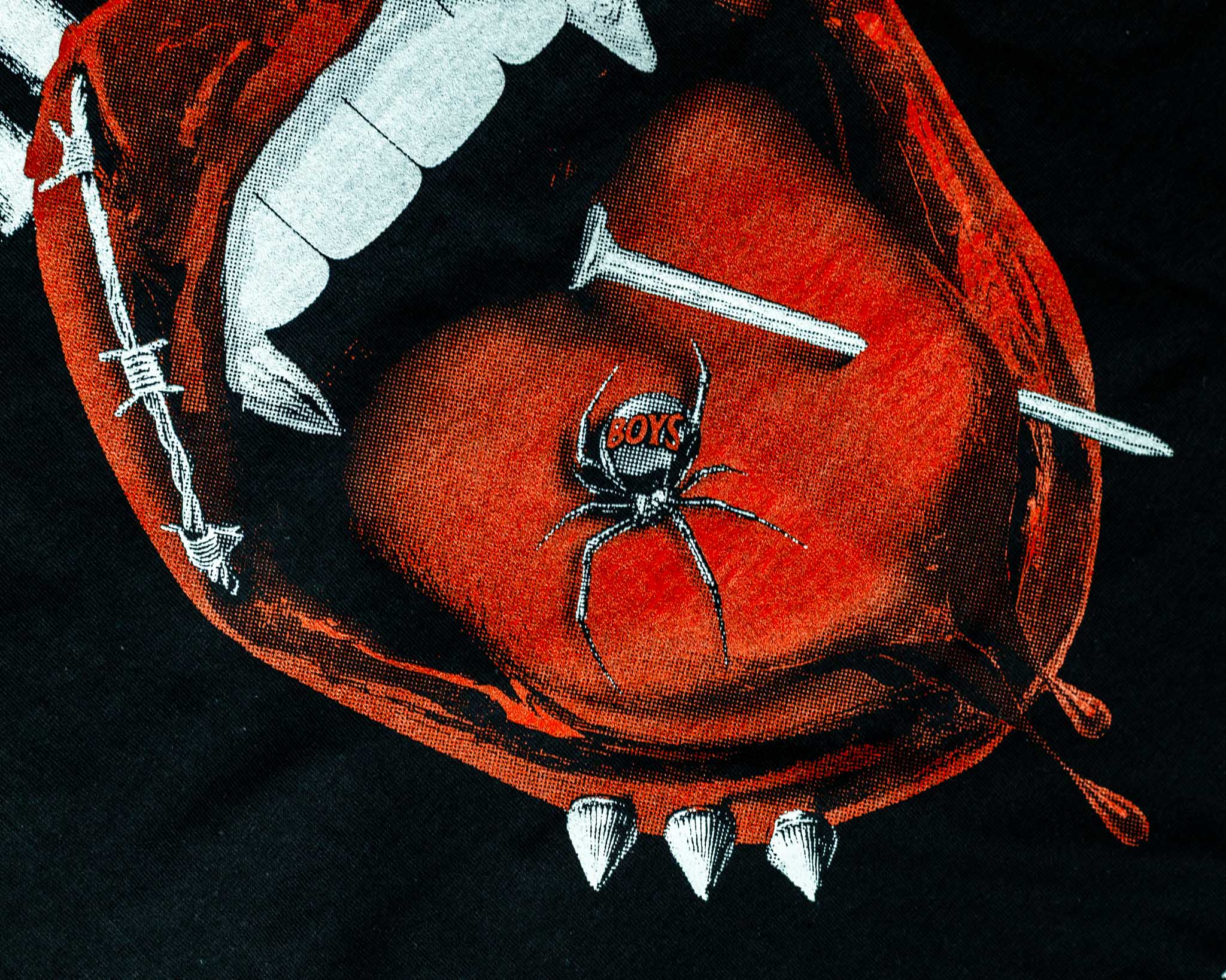 We partnered with Floricón to bring you a Halloween tee that’s flirty, fucked up, and fully feral. “I Eat Boys” on the front keeps it simple. The back? A blood-drenched mouth with fangs, spiders, and a taste for trouble.