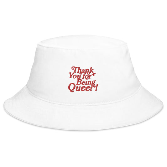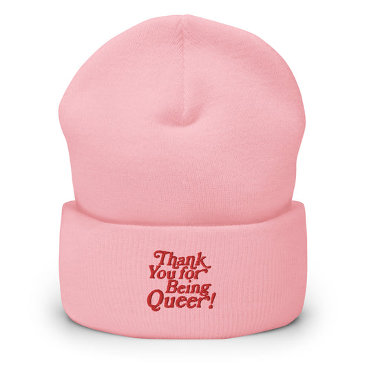 Gorro con puños bordados con la frase "Gracias por ser queer"