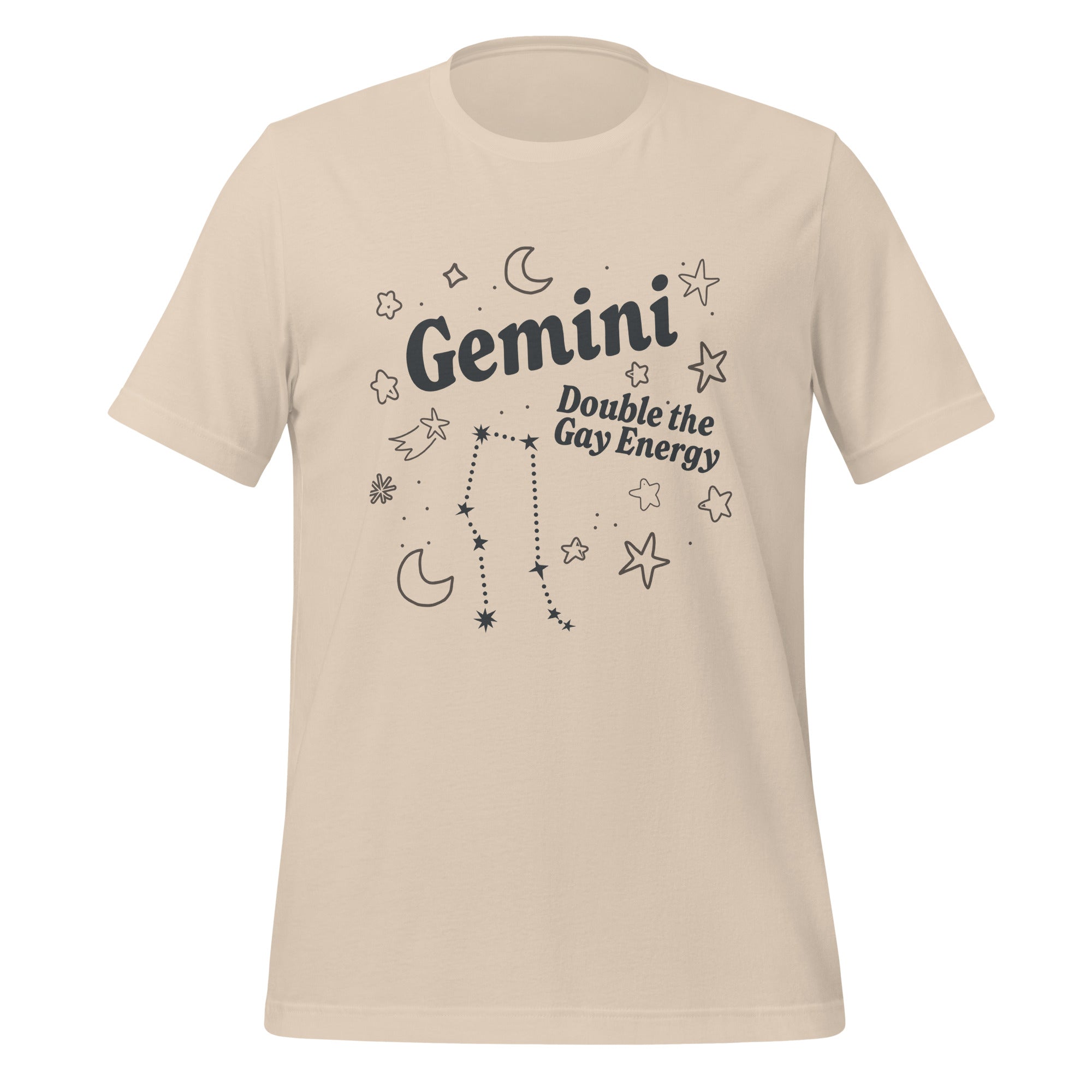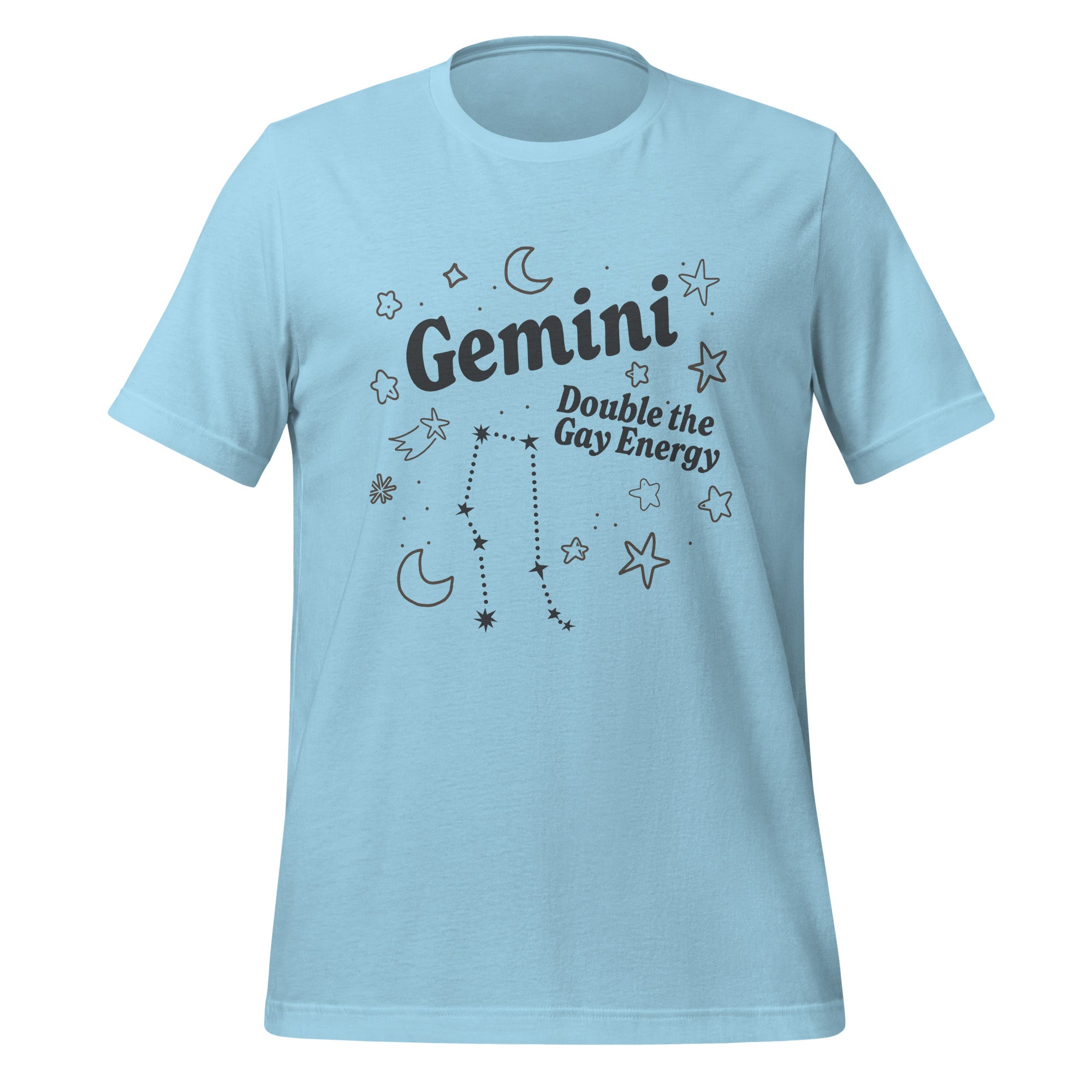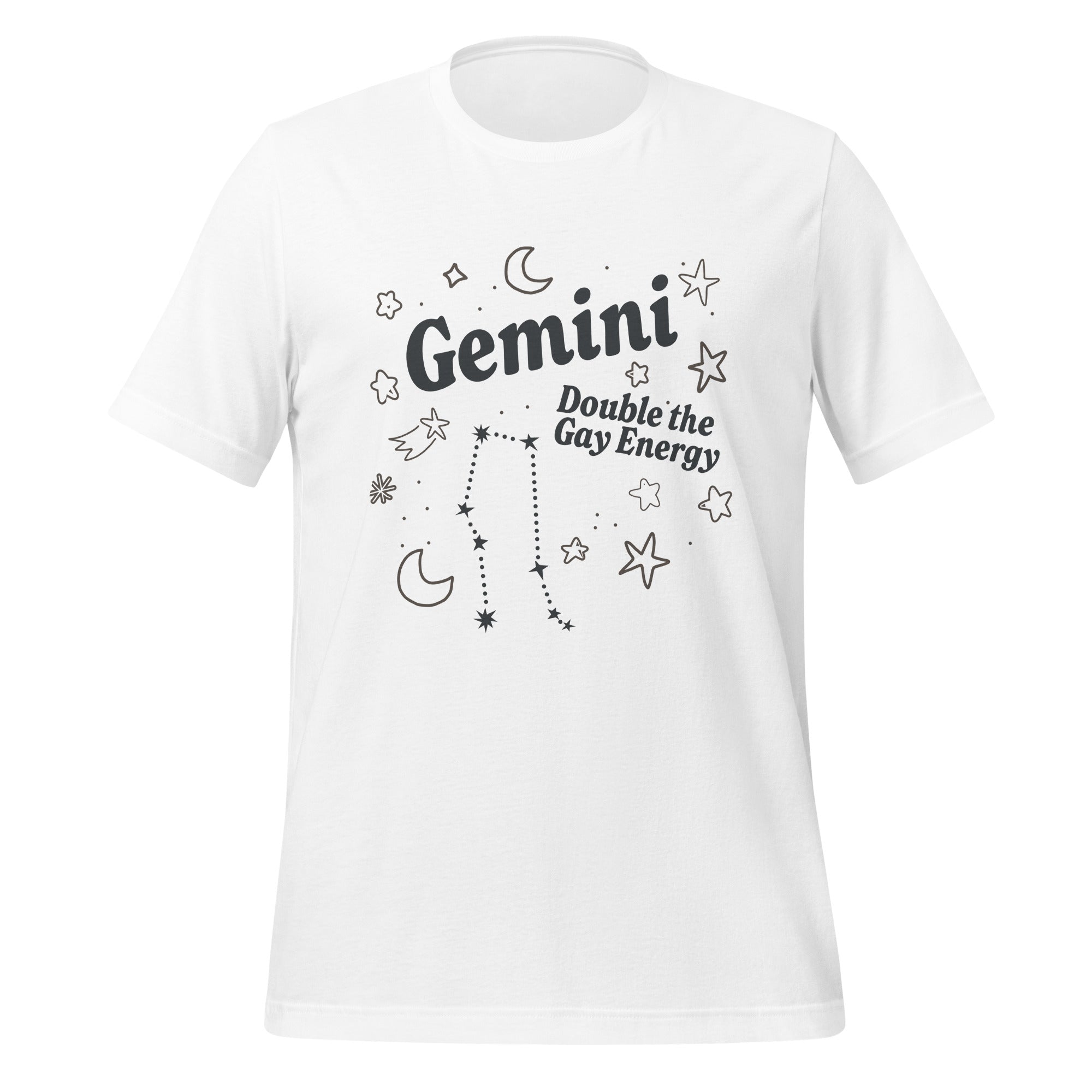 Muestra tu signo zodiacal y personalidad dinámica con la camiseta unisex "Géminis Doble Energía Gay". Con diseños celestiales, la constelación de Géminis y la frase empoderadora "Doble Energía Gay", esta camiseta ligera y elegante es perfecta para expresar tu orgullo. ¡Una prenda imprescindible para cualquier Géminis audaz!