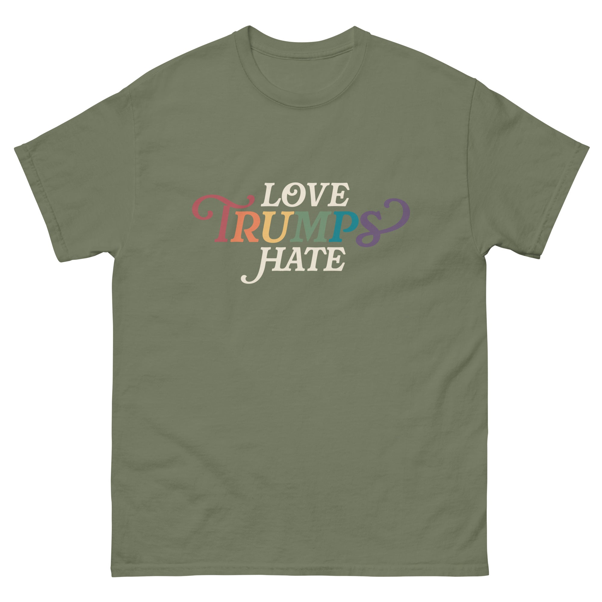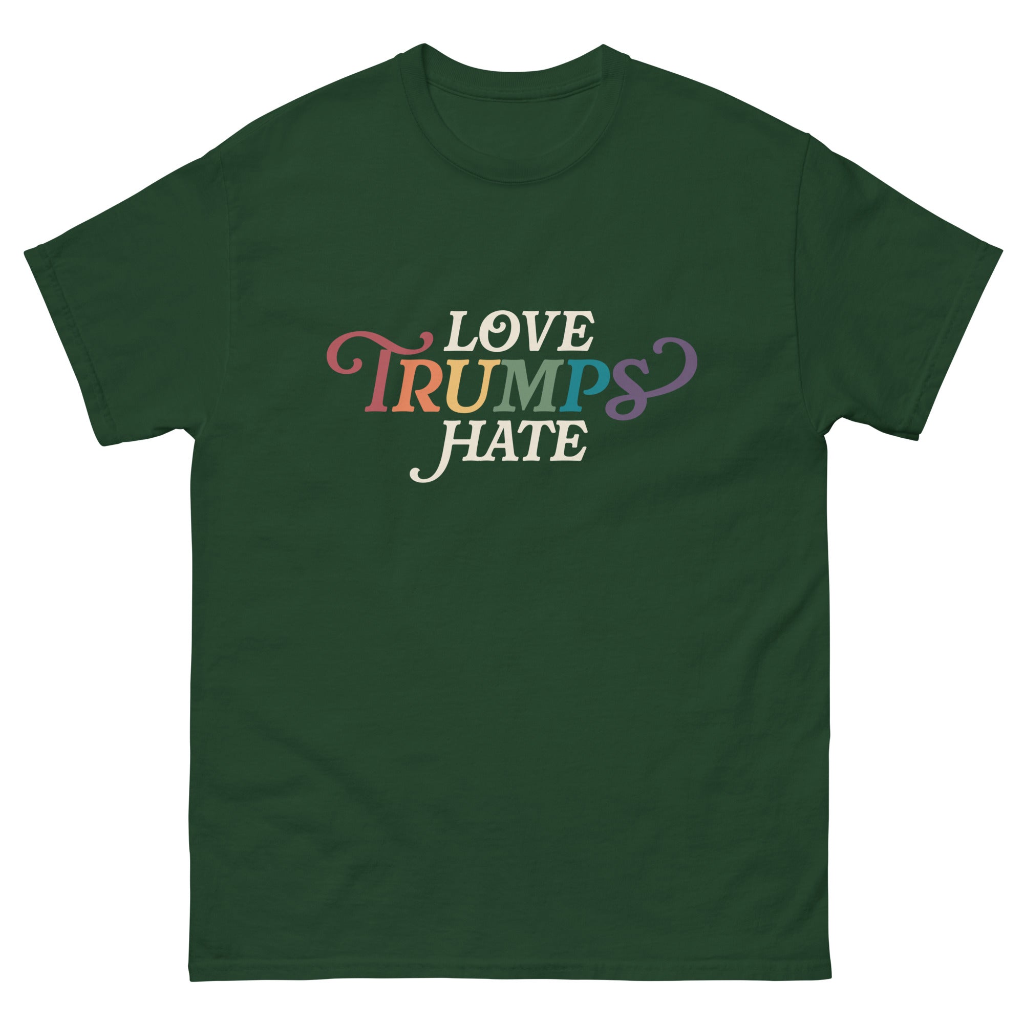 Muestra tu apoyo con nuestra camiseta unisex “Love Trumps Hate”. Con la frase en negrita “Trump” en vibrantes colores del arcoíris, esta camiseta envía un mensaje claro de amor, igualdad y unidad. Diseñada para brindar comodidad y estilo, es perfecta para cualquier día en el que quieras difundir energía positiva y oponerte al odio.