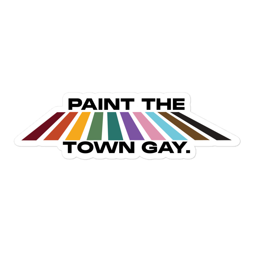 Paint the town with pride. This bold sticker features a rainbow crosswalk and the phrase Paint The Town Gay, perfect for laptops, bottles, and more.