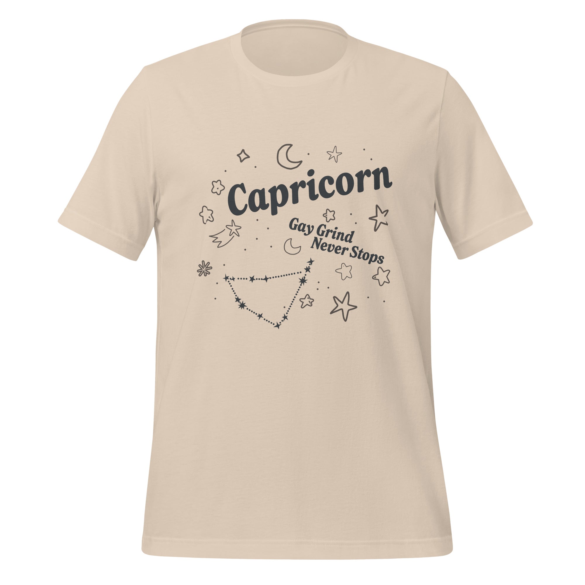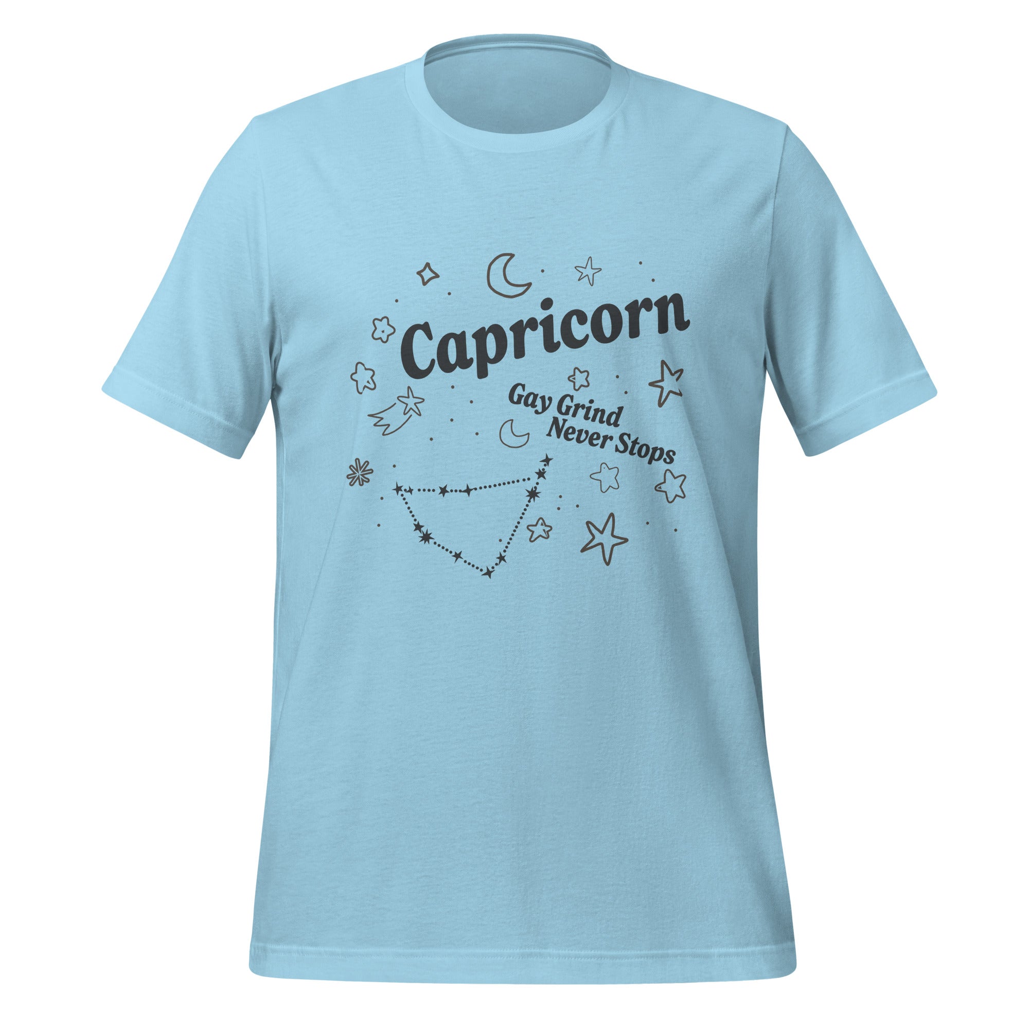 Show off your determination and pride with the Capricorn Gay Grind Never Stops unisex t-shirt. Featuring celestial designs, the Capricorn constellation, and the empowering phrase Gay Grind Never Stops, this lightweight and stylish tee is perfect for celebrating your zodiac sign and relentless energy. A must-have for every driven Capricorn!