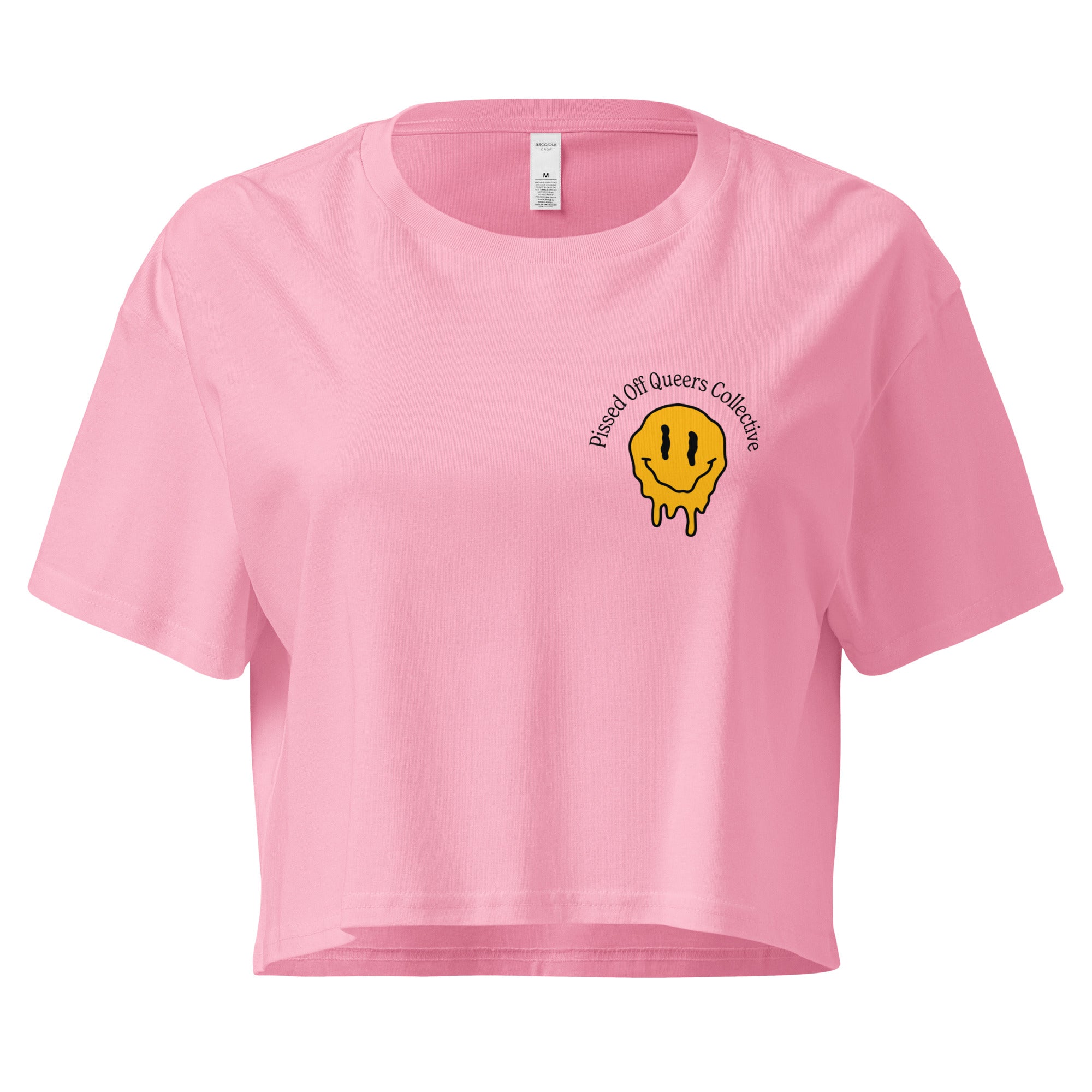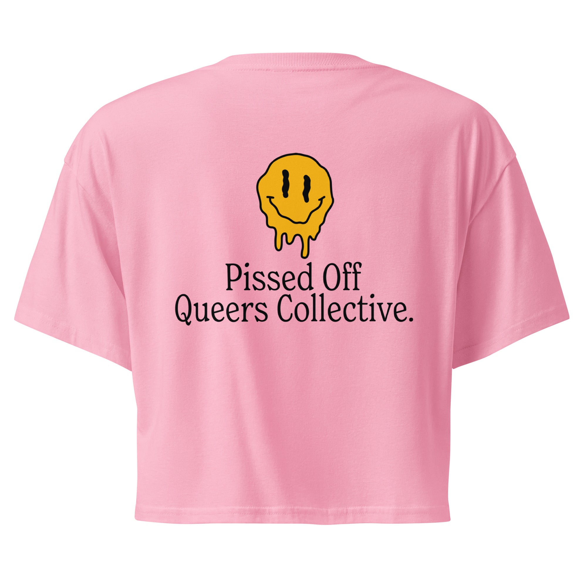 This crop top says what needs to be said. With a melting smiley and Pissed Off Queer Collective on the front and back, it is bold, frustrated, and completely unapologetic. Made for the queers who are over it and not afraid to show it.