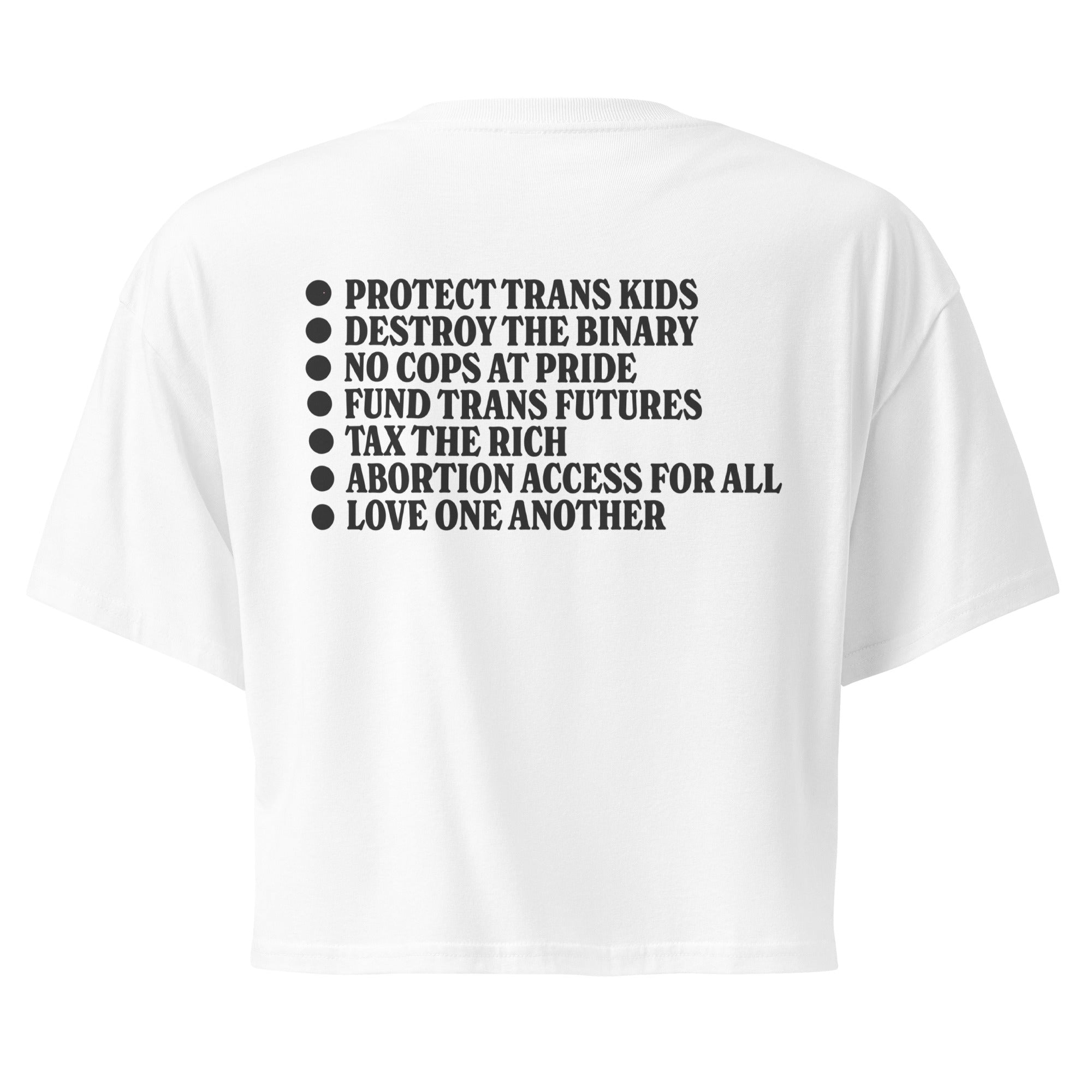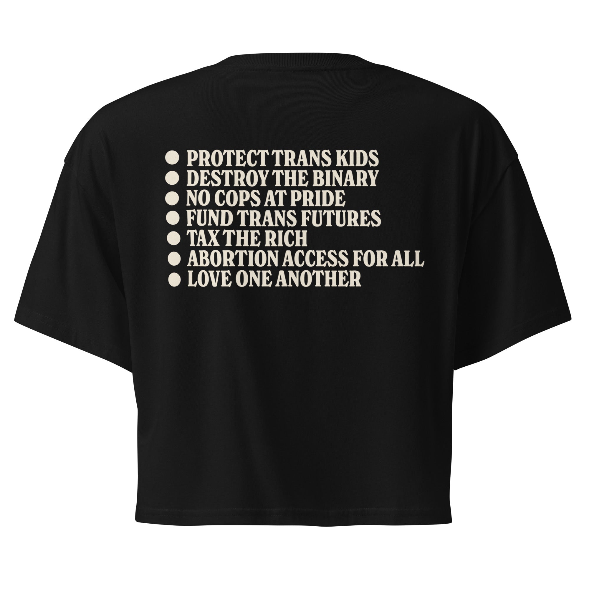 This crop top says it all. Radical Queer Agenda on the front with queer in rainbow, and the full list of demands on the back. No edits. No apologies.