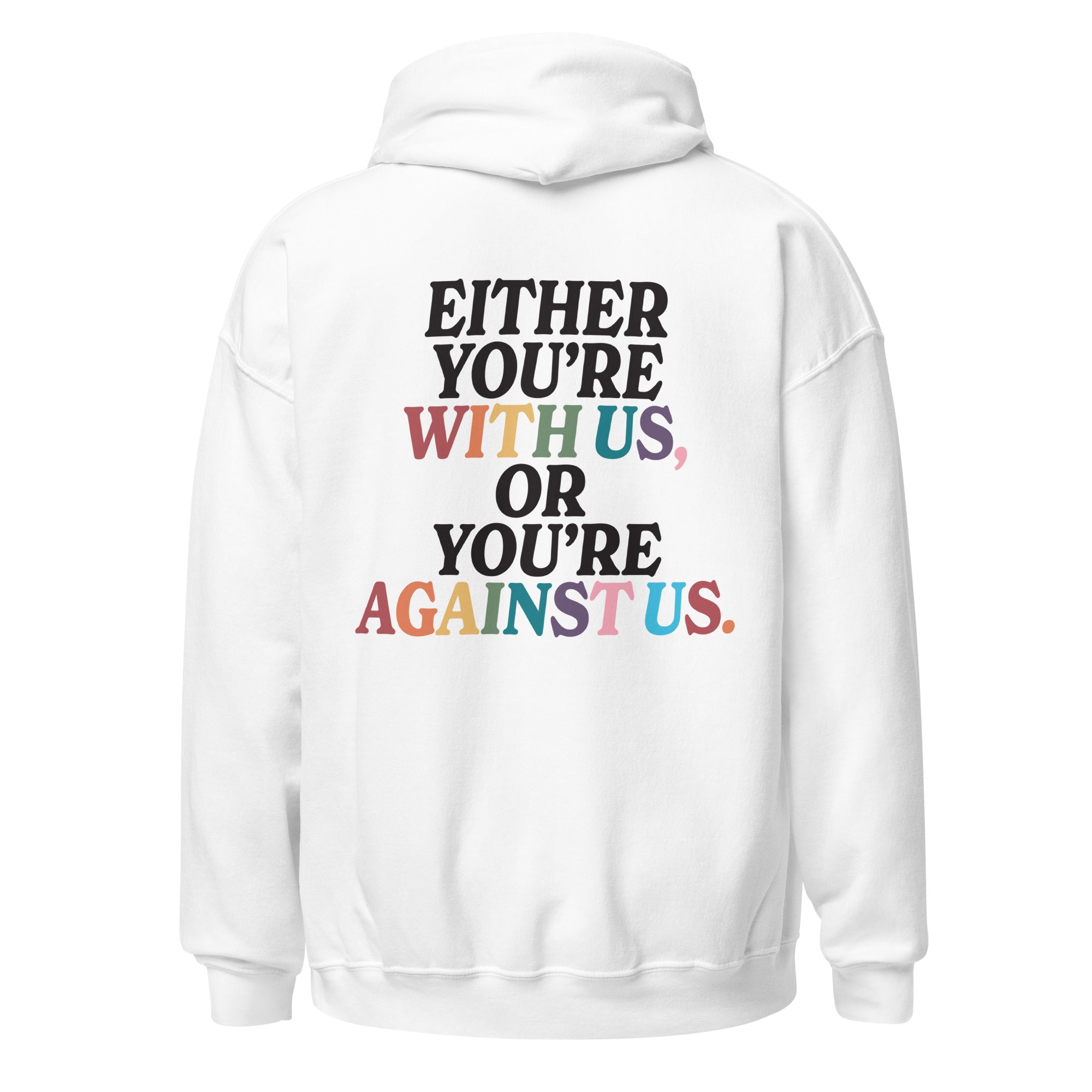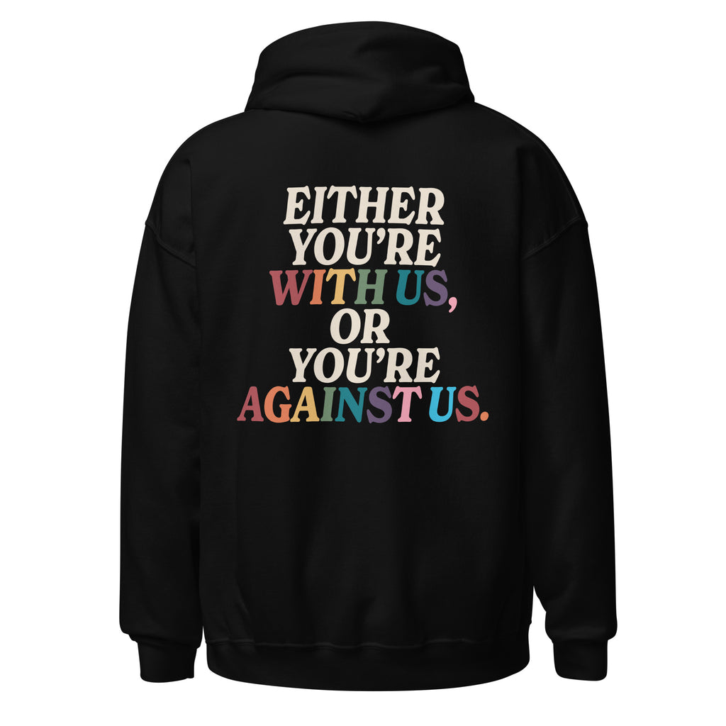 Take a stand with our Stand With Us Unisex Hoodie. Featuring “Stand With Us” on the front and “Either You’re With Us or You’re Against Us” on the back, with “With Us” and “Against Us” in vibrant rainbow colors, this bold design makes it clear—neutrality isn’t an option. Made from soft, high-quality fabric with a relaxed fit, adjustable hood, and front pocket, it’s perfect for staying cozy while standing up for Pride, activism, and equality.