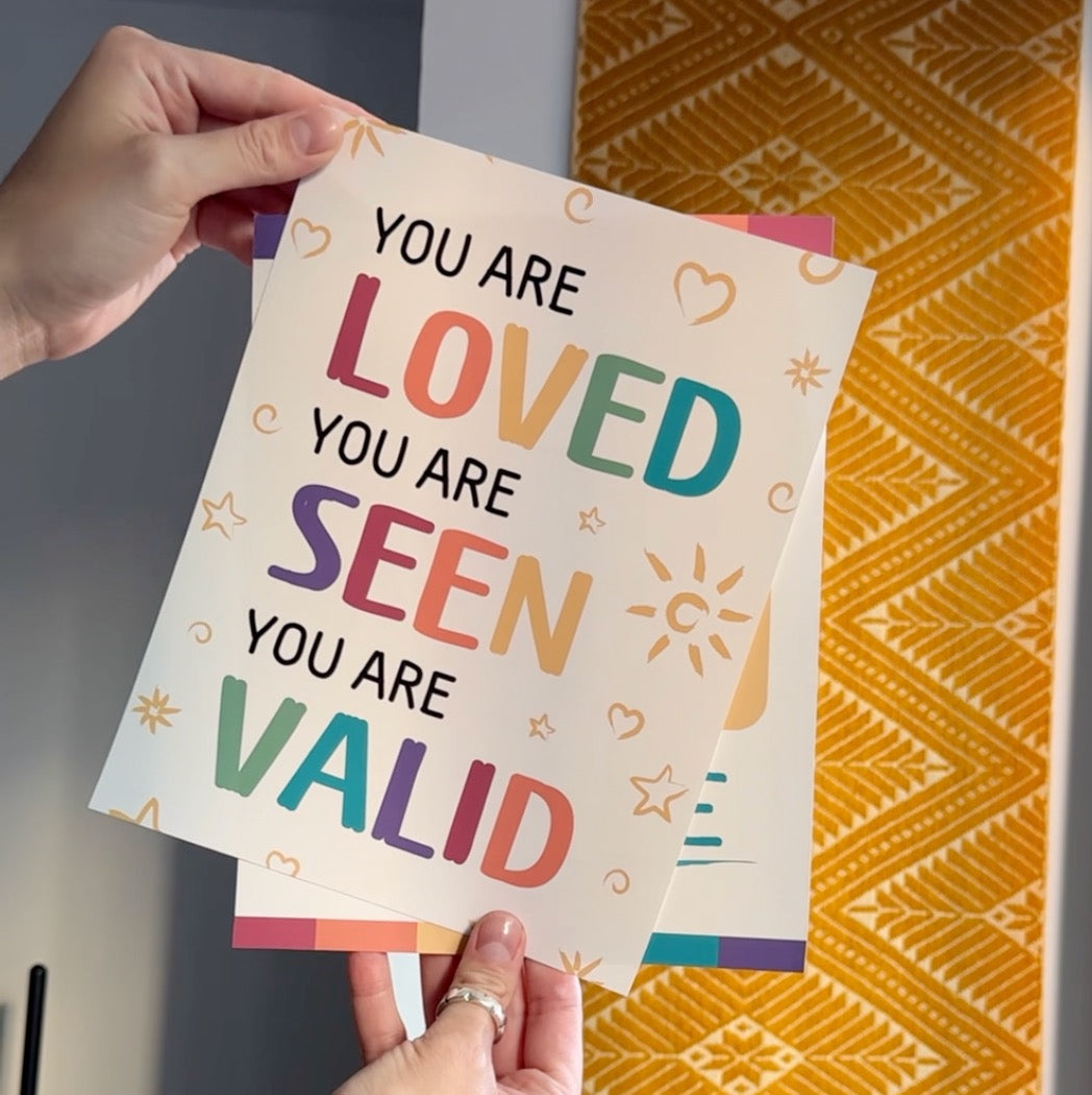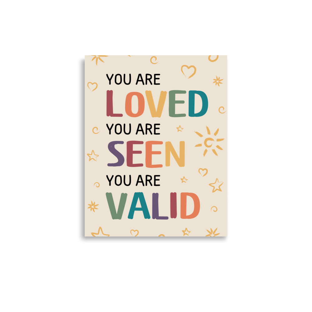 Embrace your authentic self with our vibrant “You Are Loved, Seen, and Valid” poster! Featuring empowering phrases in bold rainbow colors, this uplifting design symbolizes inclusivity and acceptance. With a playful background, it’s the perfect addition to any space that promotes positivity and self-affirmation. Hang it in your home, classroom, or community center as a daily reminder that everyone is cherished and valued. Let the love shine!